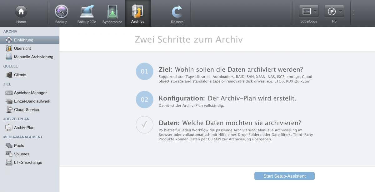 Die P5 Suite ist modular aufgebaut, Lizenzen für das Archivieren und Sichern von sehr grossen Datenmengen sind kostengünstig. Die P5 Archive Suite bietet eine umfangreiche Archivlösung, die schnell integriert ist und sämtliche Medien wie Disklösungen, LTSF oder Tapes unterstützt. Lokale Archive und verschlüsselte Clones zu einem Cloud-Anbieter werden immer beliebter. Das schon mehrmals totgesagte Tape bietet mit LTO-8 auch heute noch das beste Preis- und Leistungsverhältnis beim Sichern oder Archivieren von vielen Terrabytes an Daten. Automatisches Archivieren per Hot-Folder oder die Verwendung von zusätzlichen Metadaten und Previews sind im Standardumfang integriert.